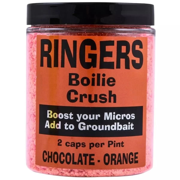 Ringers Boilie Crush, dit is iets totaal nieuw op de markt. Het zijn gecrushte boilies en de perfecte manier om je gekozen aas een extra boost te geven en meer aanbeten te krijgen. Wanneer je 2 doppen Boilie Crush per pint (0.56 liter) lokaas toevoegt aan Vb. je methode pellets, methode grondvoer om het een extra boost te geven zal dit zeker een extra boost geven. De Boilie Crush zinken als een baksteen, perfect voor op de karper, zeelt en brasem zowel op commerciële en natuurlijke viswateren.