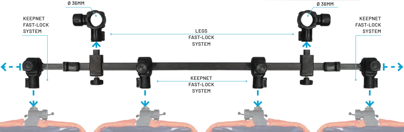 De Colmic Keepnet Bar heeft 2 telescopische verlengdelen, speciaal ontworpen om over de voorkant van je voetenplaat te passen en wordt geleverd met 4 connecteurs, zodat je meerdere witvis leefnetten kan bevestigen.