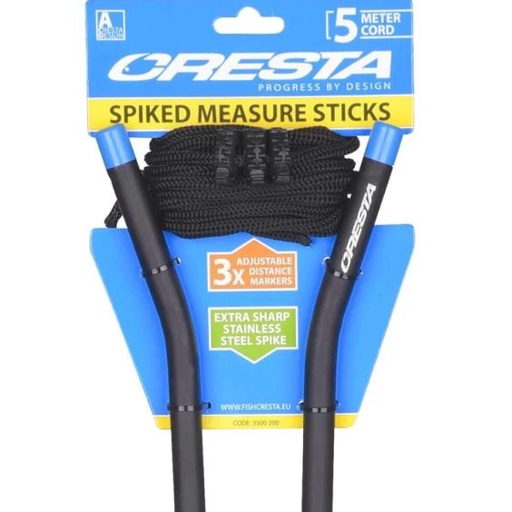De Spiked Measure Sticks vormen de ideale manier om een verkozen visafstand op te meten. Door de lijn om de Cresta afstandsstokken te wikkelen, totdat de lineclip bereikt wordt, is de exacte afstand eenvoudig te herleiden. Het meegeleverde koord bezit een lengte van 5m en is voorzien van 3 schuifknoppen voor een exacte markering. Beide Cresta sticks zijn voorzien van een massieve pin, die gemakkelijk en stevig in elke ondergrond geplaatst kan worden. De 70cm lengte van de stick boven de spike zorgt ervoor dat de lijn bij het omwikkelen boven eventuele begroeiing blijft. De gladde afwerking van de sticks en kunststof afdekknop, zorgen ervoor dat de lijn gemakkelijk en zonder beschadiging weer opgedraaid kan worden.