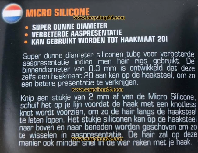 Deze fijne en vooral super dunne siliconentube kan perfect gebruikt worden bij het verfijnen van je aaspresentatie wanneer je met een hairrig vist. Deze tube is met een opening van 0,3mm klein genoeg om grip te krijgen op de stelen van haken tot en met maat 20. Adam Rooney is overtuigd van de werking van dit product, hij vist nog maar zelden met een rig zonder dat de hair gefixeerd is met tube op een QM1-haak of MWG-haak.
