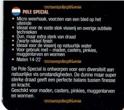 De Pole Special haak is speciaal ontworpen voor de vaste hengel visserij in combinatie met natuurlijke en levende aassoorten op vissoorten als brasem en voorn. Deze unieke en zeer fijne haak is voorzien van weerhaak en heeft daarnaast nog een aantal unieke eigenschappen die de Pole Special haak onderscheid van de rest!