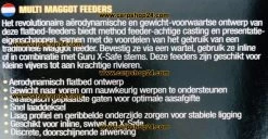 De Multi Maggot feeder is zoals de naam al doet vermoeden ontworpen om maden in te vervoeren. De feeder is voorzien van een klepje dat gemakkelijk te openen is en waardoor de maden gemakkelijk in de feeder gedaan kunnen worden. Door de verschillende gaten kunnen de maden gemakkelijk ontsnappen onder water, waardoor je een zeer effectieve en vooral attractieve manier van voeren creëert.