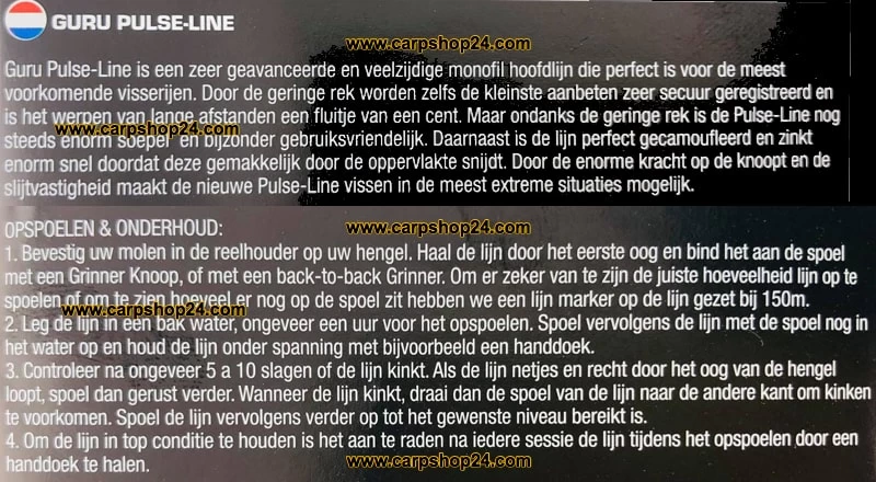 Pulse lijn is een uitermate hoogwaardige nylon lijn, gemaakt volgens de nieuwste technieken. Zo bevat de lijn weinig rek, werkt super gemakkelijk, kinkt niet, zinkt als een baksteen en is eerlijk aan diameter! Al deze eigenschappen maken deze lijn tot de ultieme lijn voor het feedervissen in welke vorm dan ook!