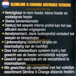 De X-Change Distance feeders zijn speciaal ontworpen voor de traditionele feeder visserij. Daarnaast bezitten deze feeders enkele unieke eigenschappen zoals de onderling verwisselbare loden ringen en het lijn bevestigingssysteem waarbij geen krimps meer zijn gebruikt.
