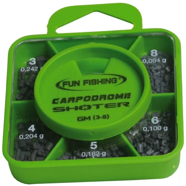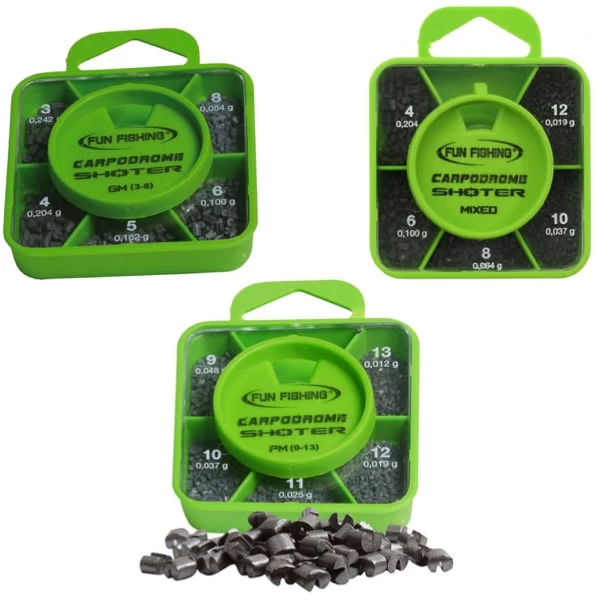 De Shoters zijn ultrakalibreerde cilindrische zinkers bedoeld voor het vissen in carpodrome of in traditionele competitie. Ze hebben een zeer diepe afgeschuinde groef waardoor ze gemakkelijker te plaatsen zijn en een uitstekende grip op de draad garanderen, ook bij grote diameters (dit voorkomt dat ze verloren gaan in gewelddadige gevechten). Gemaakt van tin, niet van lood, zijn de Shoters beide milieuvriendelijker en kunnen ze gemakkelijk langs de lijn worden verplaatst zonder deze te beschadigen. Dankzij hun vorm zijn ze ook gemakkelijker te verwijderen.
