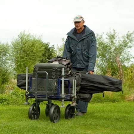 Maakt het vervoer naar de stek bijzonder aangenaam. De ondersteuningsbalk is volledig instelbaar voor vervoer van onze Preston zitboxen en kan ook worden omgedraaid om de kruiwagen geschikt te maken voor veel andere merken zitboxen. Omdat vier wielen al het gewicht dragen, rijd je comfortabel naar de visplek. Het probleem van lekke banden is opgelost door de montage van massieve banden, die kunnen worden ingesteld om meer ruimte onder het frame te creëren. De Preston transportkar kan volledig gedemonteerd worden voor vervoer in de auto en om deze thuis op te bergen. Wordt compleet geleverd met opbergzak voor kleding of aas.