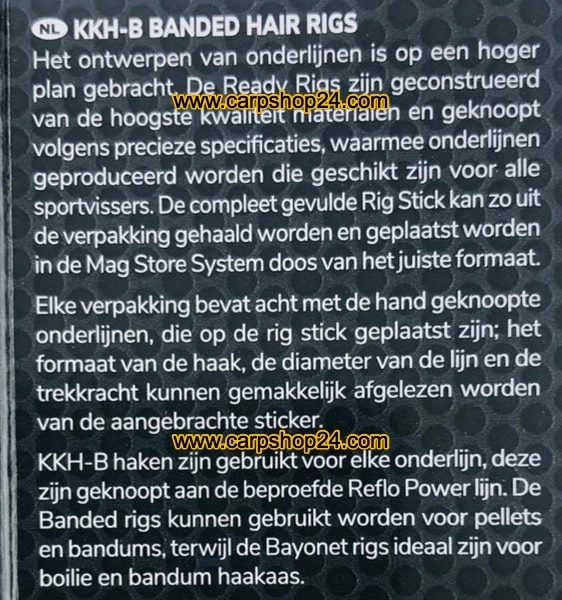 KKH-B haken zijn gebruikt voor alle onderlijnen, deze zijn geknoopt aan de beproefde Reflo Power lijn. De Banded rigs kunnen gebruikt worden voor pellets en bandums, terwijl de Bayonet rigs ideaal zijn voor boilie en bandum haakaas.