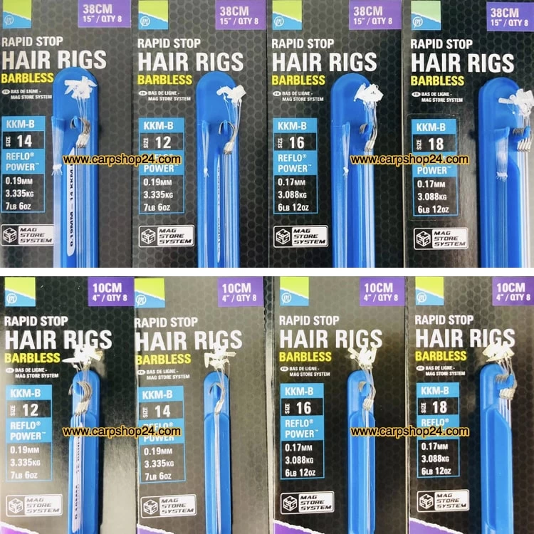 er onderlijnen beschikbaar zijn voor elke vismethode. De geheel gevulde ‘rig stick’ kan zo uit de verpakking gehaald worden en in de Mag Store System Box van het juiste formaat gedaan worden. Elke verpakking bevat 8 met de hand geknoopte onderlijnen die op de rig stick bevestigd zijn, de haakmaat en de diameter plus treksterkte van de lijn zijn eenvoudig af te lezen op de aangebrachte sticker. Voor elke onderlijn zijn KKM-B haken gebruikt, die geknoopt zijn aan de beproefde Reflo Power lijn. Een aasband of Rapid Stop completeren de onderlijn, hiermee zijn ze geschikt om een groot aantal verschillende aassoorten met een hairlijn aan te bieden.